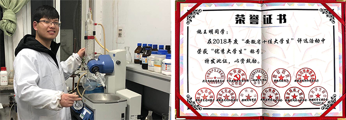 施王明热衷于发明创造,勤于思考,勇于创新。在校期间,以第一发明人的身份获得了2项国家发明专利和2项实用新型专利授权,还有1项实用新型专利正在审查。同时,“一种实验室废液处理和净化装置”“一种含二硫缩醛的衍生物制备方法、用途”等多项发明专利准备申报。他热爱科学研究,自进入导师科研实验室,积极投身于科学研究,以主要作者的身份在SCI收录期刊上发表1篇科研论文,围绕着“基于植物免疫为向导磷酸酯类化合物的设计与合成”这个课题,主持1项省级大学生创新创业训练项目(项目编号:201710373055),他带领团队一起探索高效抗癌活性药物的合成与筛选工作,该项目目前已经发表1篇SCI论文。同时,他还参与了导师的国家青年自然科学基金项目。课余时间,施王明积极参加科技创新创业比赛,曾获得校大学生创新创业大赛一等奖、校大学生“挑战杯”课外学术竞赛银奖、校“挑战杯”创业计划大赛铜奖。其中的“互联网+基于光催化技术下的空气节能净化器”项目正在淮北市源创客经行孵化对接当中。